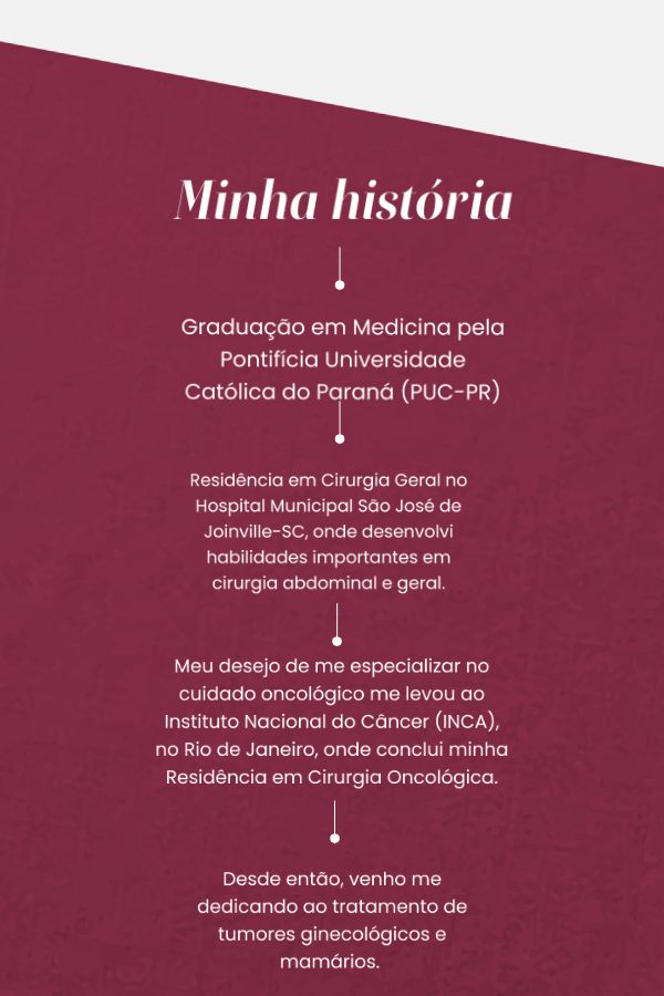Meu propósito é oferecer o melhor cuidado possível às minhas pacientes, utilizando técnicas avançadas e com um olhar humano, acolhedor e empático. Acredito que a jornada de cada mulher no tratamento oncológico deve ser acompanhada com carinho, segurança e transparência.
